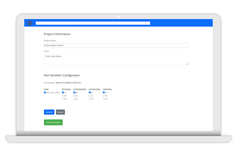 Integrate your existing specification data with your website’s front end, enabling customers to configure item numbers and download personalized spec sheets. Users can also add project-specific details such as project name, project type, date, and notes to tailor the configured specifications to their needs.
