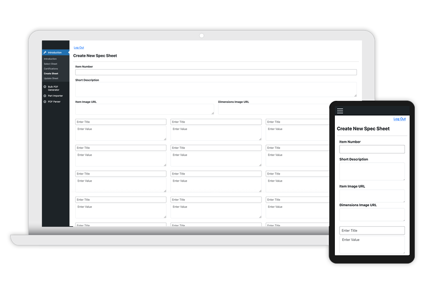 Easily generate professional spec data sheets in minutes—no design work needed. Just input your product info, and instantly download a polished PDF. Update anytime and regenerate with a click. Choose from multiple templates or work with us to create your own. Access and edit your data from anywhere, whether you’re at your desk or on your phone. Fast, flexible, and hassle-free.