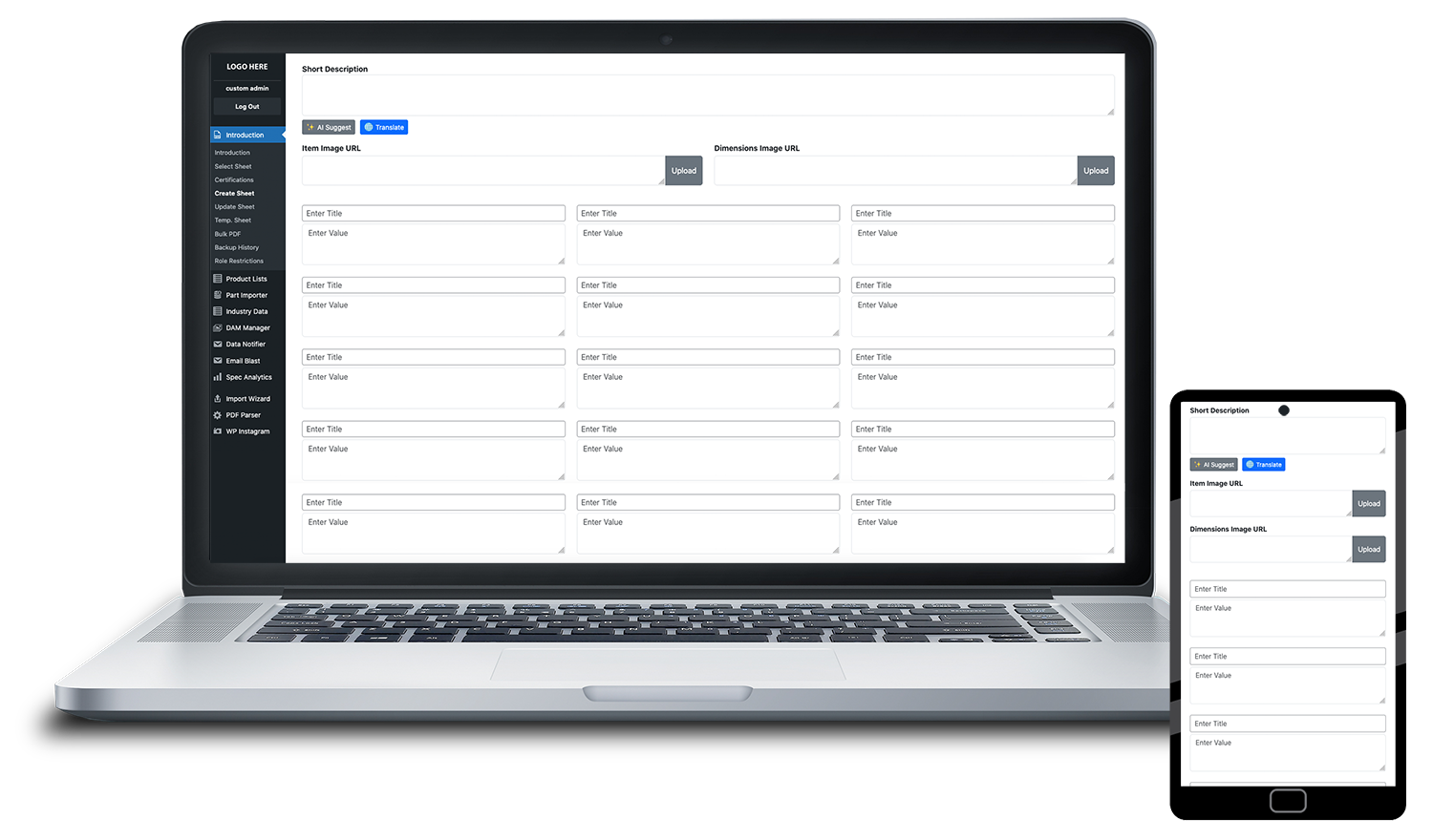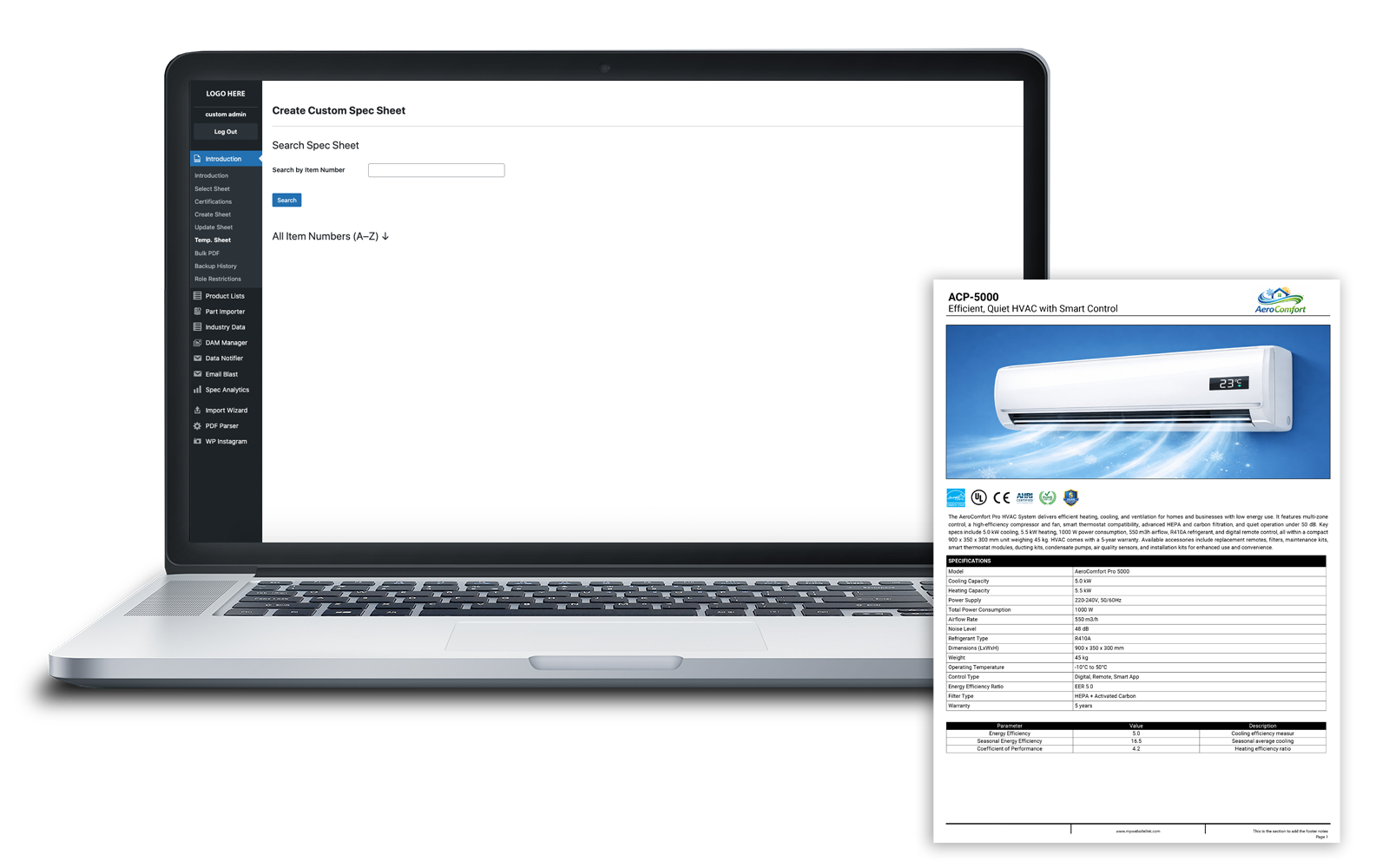 Simply input your product data, and customize every field to suit your exact needs. Choose from a variety of pre-made templates, or work with us to create your own. Our AI-powered tool enhances your spec sheets with auto-generated text and multiple language translations. Generate polished PDF data sheets in minutes, and easily sync your data to your website. Fast, flexible, and fully customizable to your business needs.
