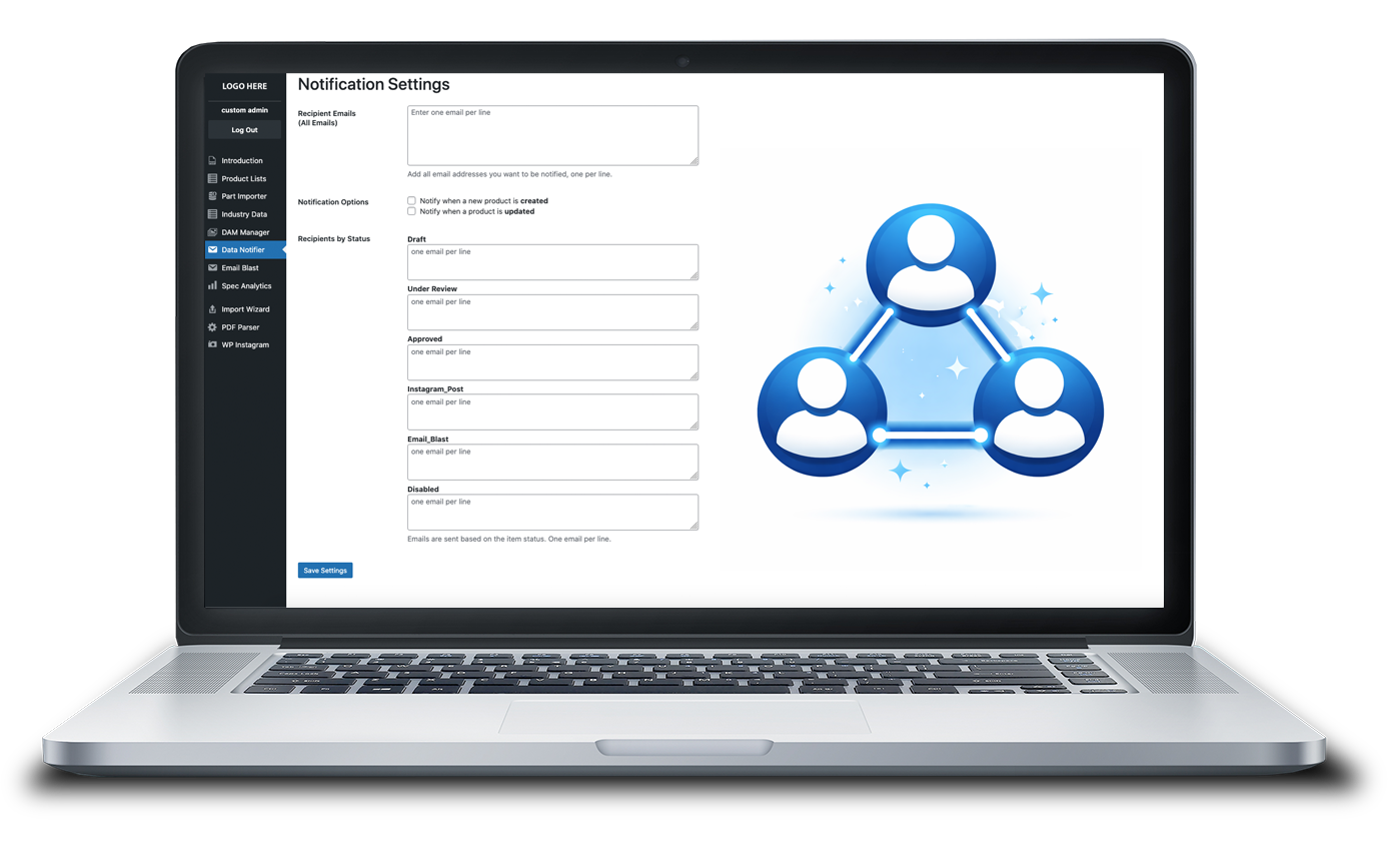This application lets you control user notifications by choosing which users are notified at each spec sheet status. You can set automatic email alerts to specific users whenever a spec status changes, ensuring the right people stay informed at the right time. This streamlines communication and keeps teams aligned throughout the entire spec sheet workflow.