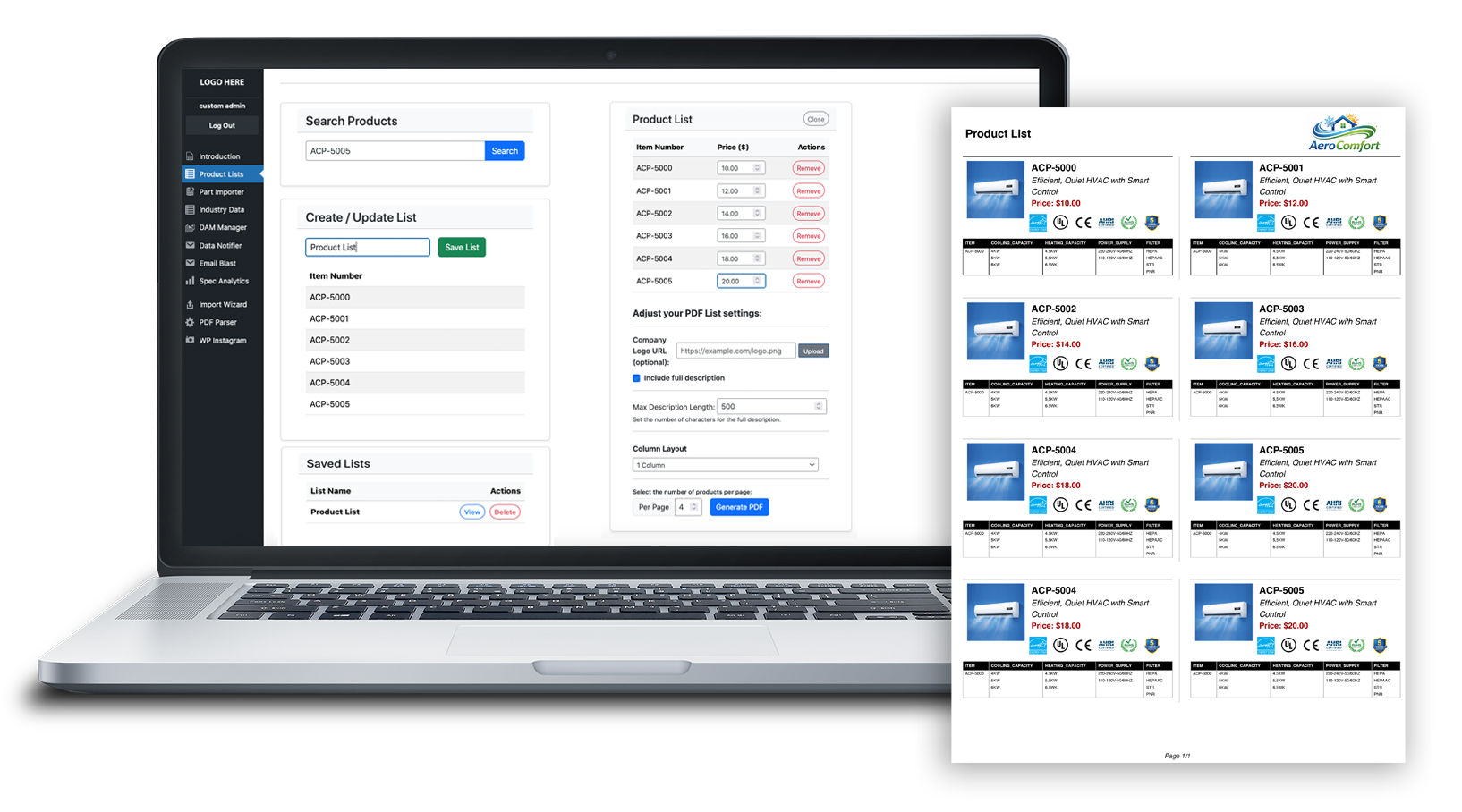 Specrafter application allows you to easily create customized product lists using all products saved in your database and convert them into professional, print-ready PDF documents. You can add pricing, organize products, and adjust the layout to support marketing, sales, and other business needs. The result is a clean, branded PDF that’s ideal for proposals, presentations, and customer communications, helping you share product information clearly and efficiently.