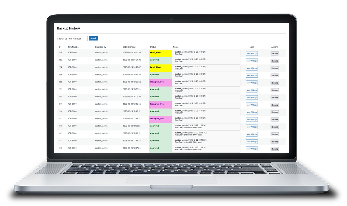 Keep complete control of your spec sheets with a detailed change log and backup system. Track who made changes, when they were made, the current status of each spec, and all related notes in one place. Easily restore previous versions at any time, ensuring accuracy, accountability, and peace of mind throughout the entire workflow.