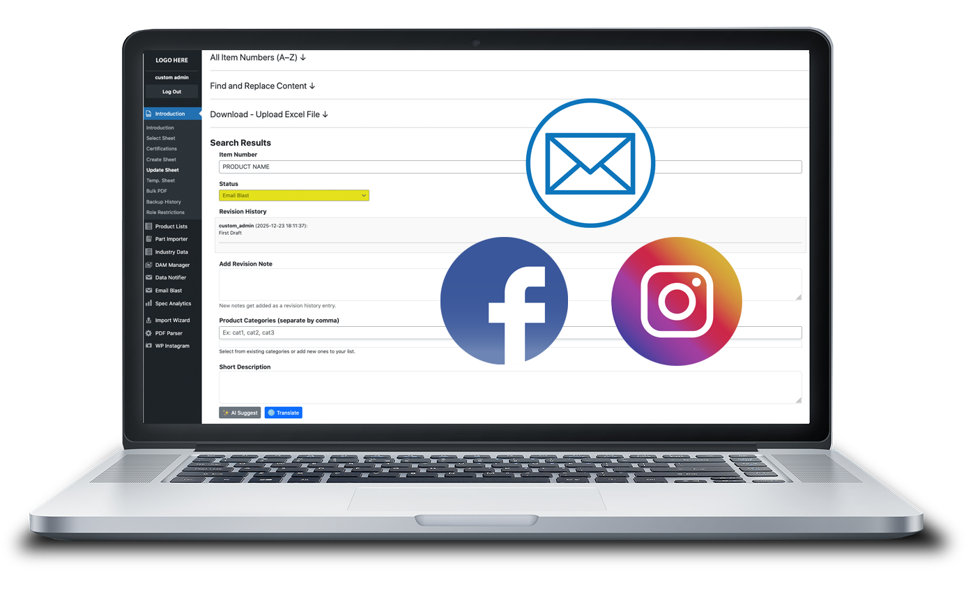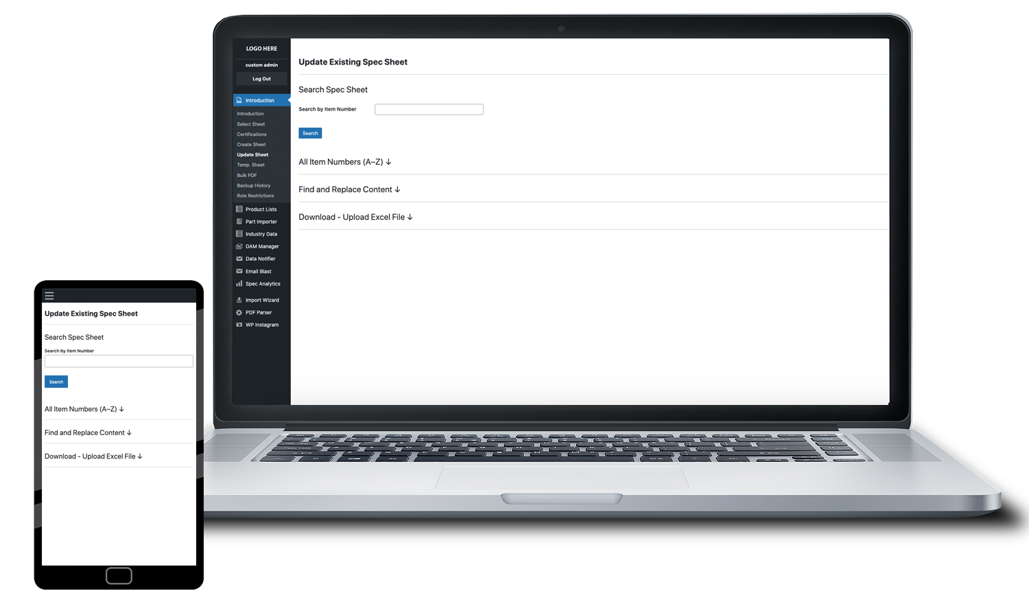 Updating your product data is effortless. Select the product, edit any fields, use find and replace to update text across multiple specs, and instantly regenerate your PDF. Easily upload or download data via Excel for bulk updates. All changes automatically sync to your website, keeping every platform up to date with a single click.