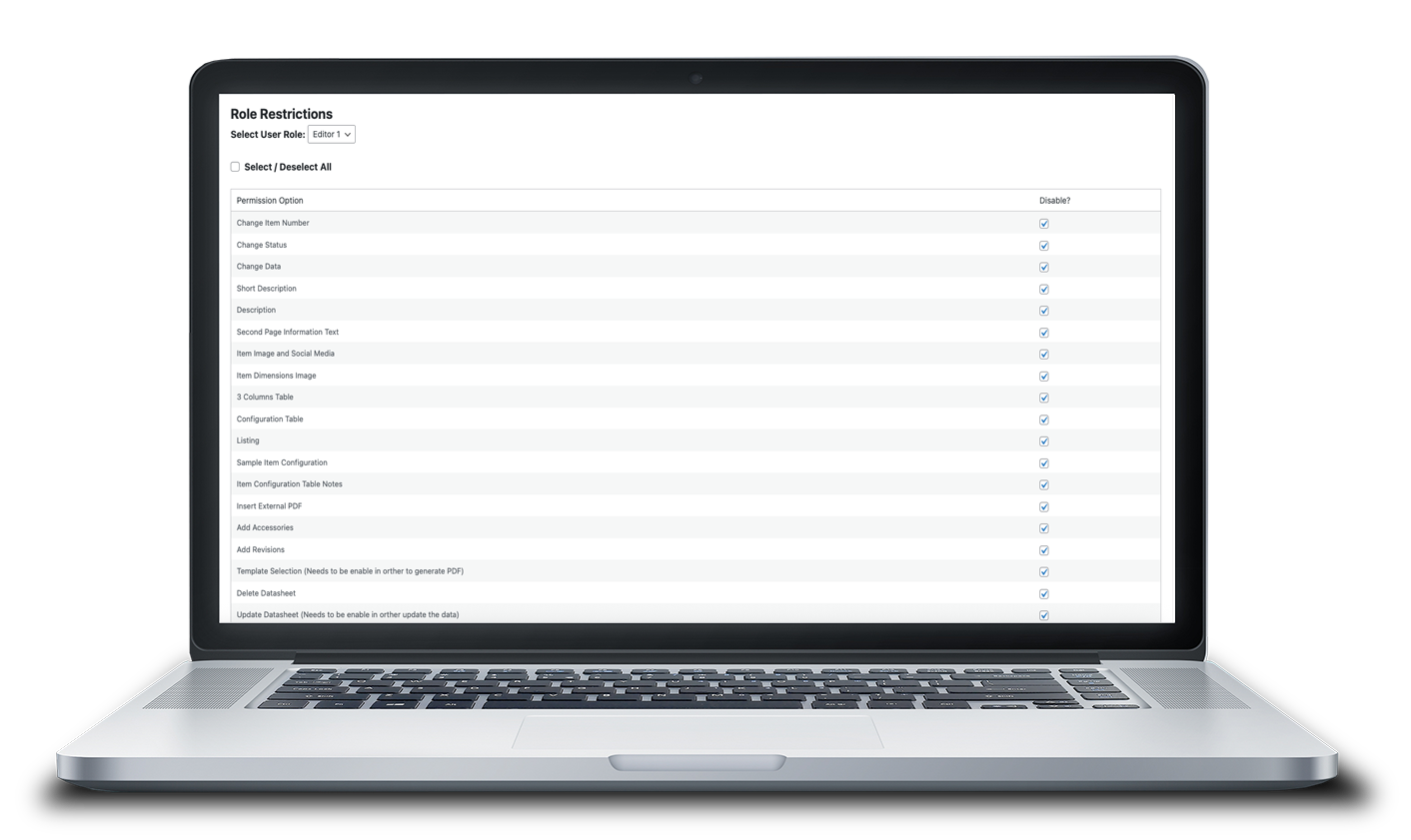 Administrators can easily define user roles and control access across the platform. Assign specific permissions to each team member, restricting or granting access to tools involved in spec sheet creation, editing, approvals, and publishing. This ensures a structured workflow, reduces errors, and keeps sensitive product data secure—ideal for B2B teams managing complex product information.
